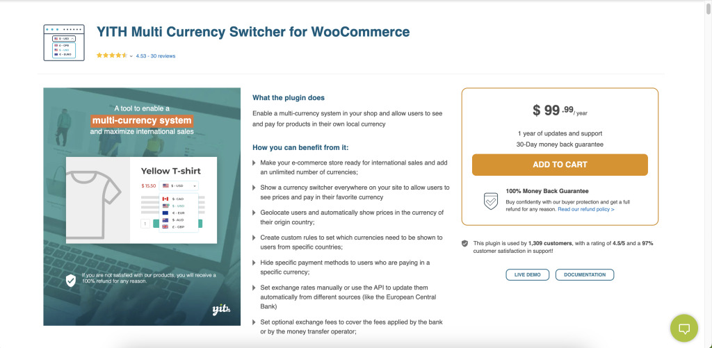 YITH’s Multi-Currency Switcher allows users to switch between currencies effortlessly. It offers geolocation-based currency detection, unlimited currency options, and customizable exchange rates.
